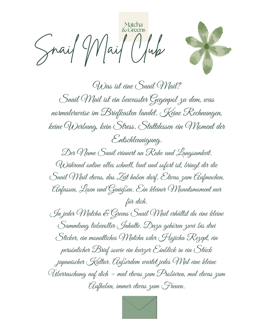Unsere Snail Mail ist eine kleine monatliche Pause vom Alltag. Kein Stress, keine Rechnungen, kein Spam. Stattdessen bekommst du einen liebevoll gestalteten Brief, der dich entschleunigt, dir ein Stück japanische Kultur näherbringt und deinen Monat auf eine besondere Art startet.
